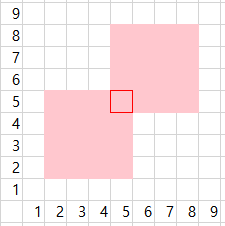 각 점의 x좌표마다 [y, y+R] 구간에 +1을 업데이트하고, 각 점의 'x좌표 + R + 1'마다 [y, y+R]구간에 -1을 업데이트하면, 임의의 어떤 지점을 보았을 때, 그 값이 K라면 길이가 R인 정사각형 안에 K개의 점이 포함된다고 판단할 수 있다.